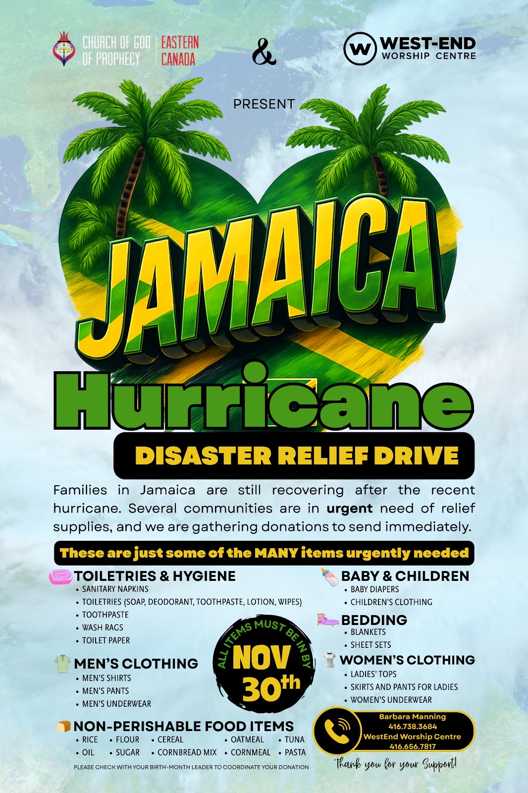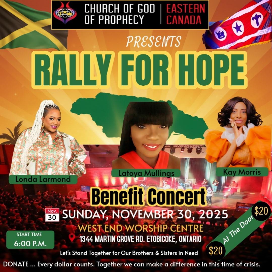 This event is a benefit concert dedicated to raising support for Jamaica Hurricane Relief following the devastation caused by Hurricane Melissa. Join us on Sunday, November 30, 2025 at 6:00 PM for an evening of worship featuring Londa Larmond, Latoya Mullings, and Kay Morris. All proceeds will go toward relief efforts as we stand together to help restore and rebuild affected communities.