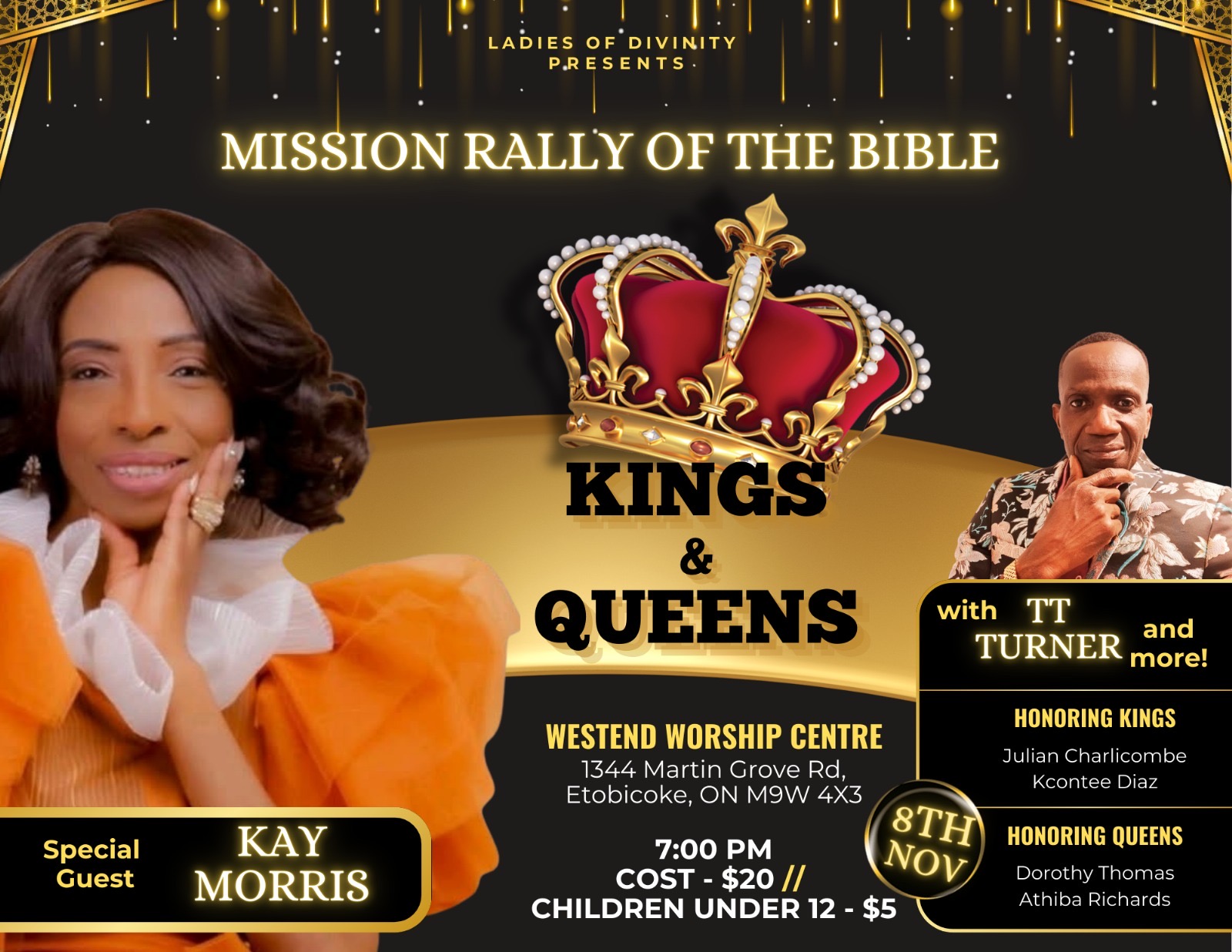 This dynamic worship rally—“Kings & Queens”—brings together music, faith, and celebration featuring Kay Morris, TT Turner, and more, presented by the Ladies of Divinity at West End Worship Centre.